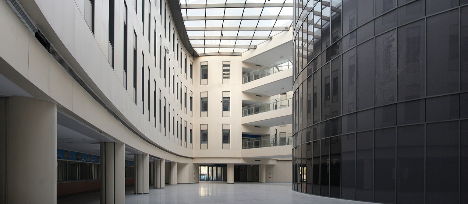 天壇醫(yī)院A1門(mén)診樓是鋼框架加支撐的結(jié)構(gòu)體系,平面是內(nèi)圓與外環(huán)通過(guò)三道連橋連同的造型。外環(huán)輪廓是圓形與等邊三角形的融合,直徑約80m,結(jié)構(gòu)沿徑向滿布兩跨框架。中間的圓形大廳直徑26m,根據(jù)建筑需要,中心是一個(gè)直徑18m的圓形無(wú)柱空間,通過(guò)三相框架梁互相搭接形成。內(nèi)外連接通過(guò)三道跨度14m的鋼橋連接,并形成三個(gè)大中庭空間。