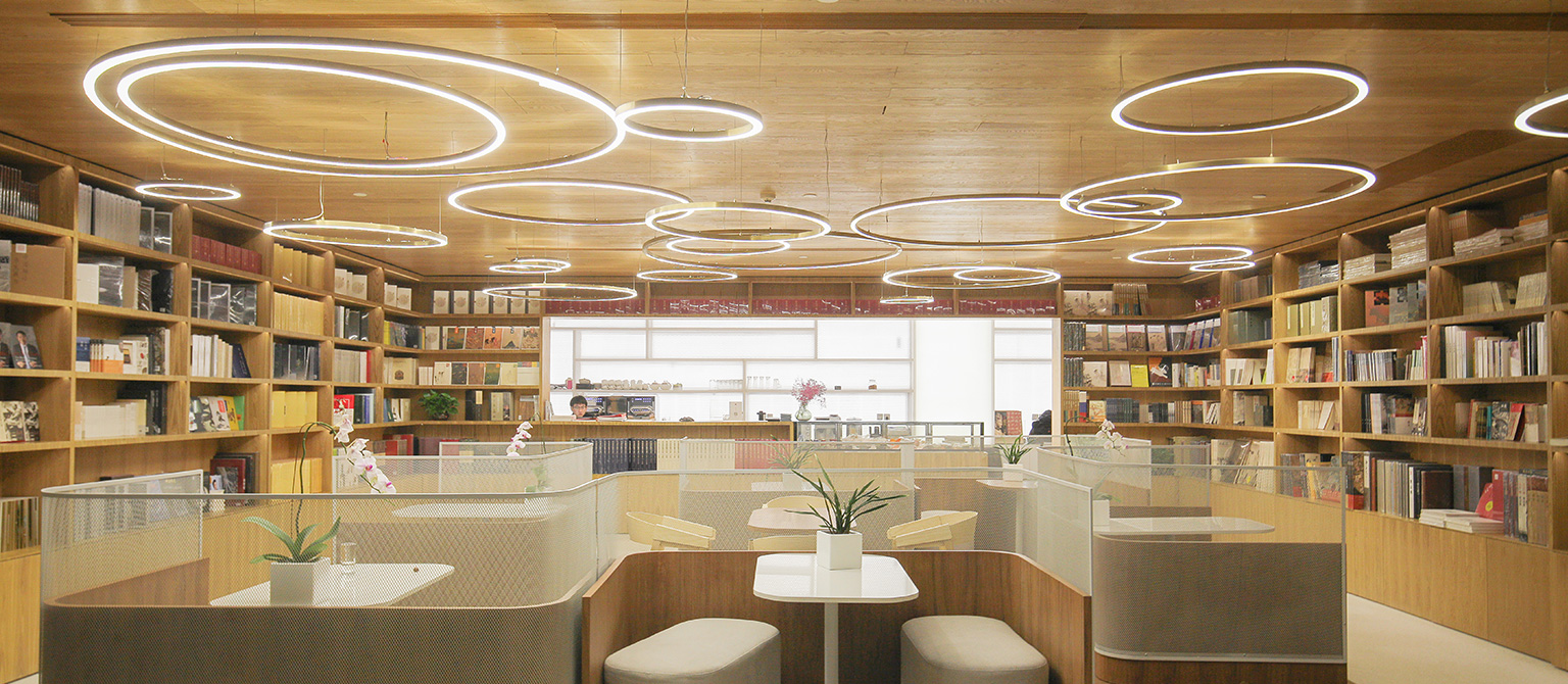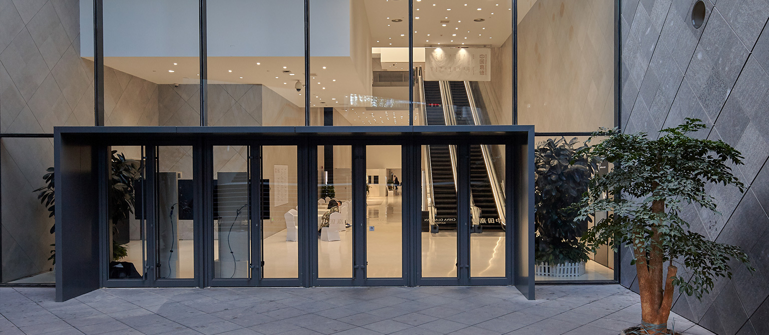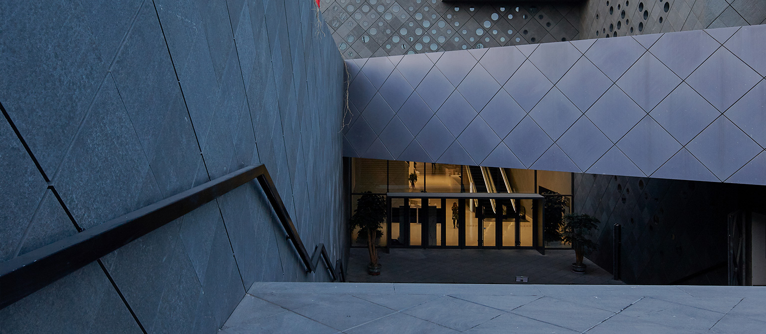 外幕墻首層至四層為菱形間隔單元式石材幕墻系統(tǒng),上部4-8層外立面為錯縫玻璃幕墻預制型小單元系統(tǒng)。圓形雙面玻璃鏡筒內(nèi)置LED燈鑲嵌在深灰色石材幕墻上,抽象的呈現(xiàn)了中國元代畫家黃公望的富春山居圖。