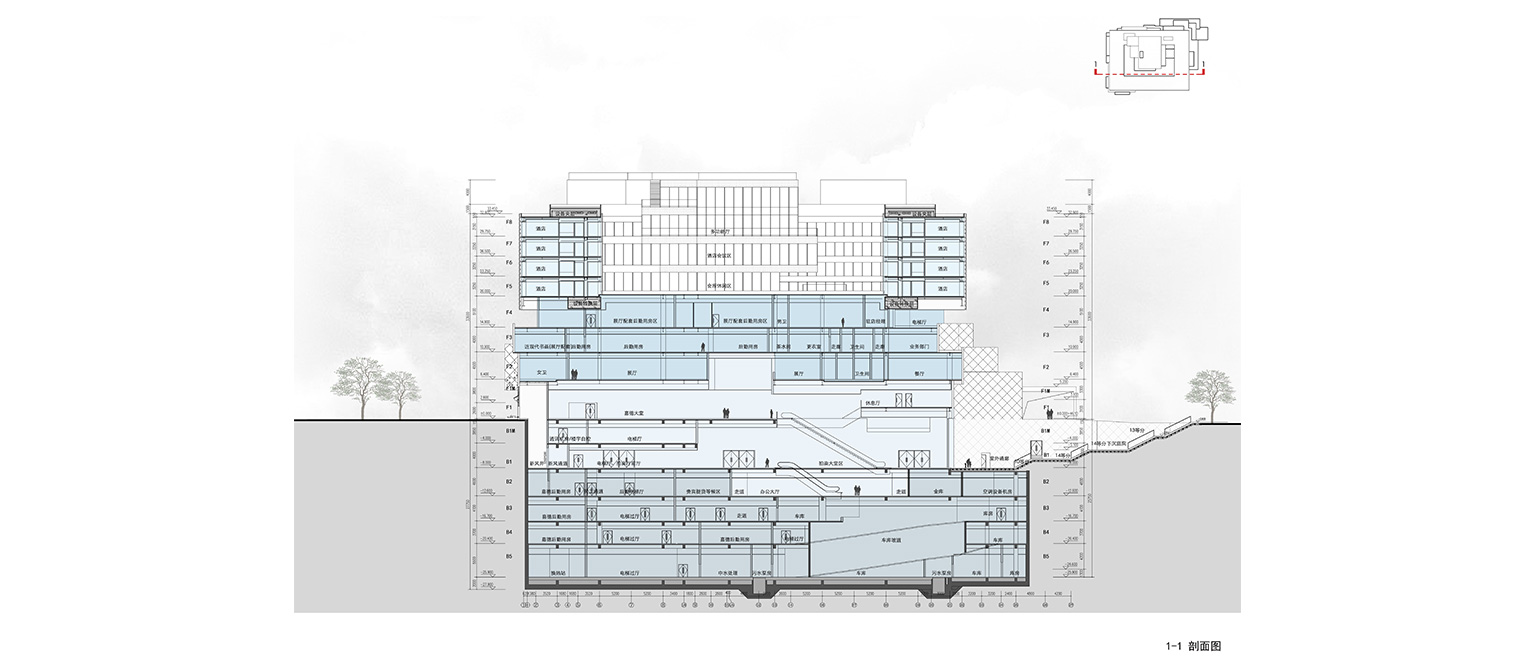 嘉德藝術中心為復雜超限高層建筑工程,地下5層,最大埋深28.5m,地上9 層,總高37.0 米,建筑面積約5.6萬平米。結構體系復雜:混凝土筒體小,結構跨度大,轉(zhuǎn)換結構多,上部酒店層均通過懸挑功能實現(xiàn),懸挑跨度大、層數(shù)多。建筑功能多,限制條件多,層高低而凈高需求大。