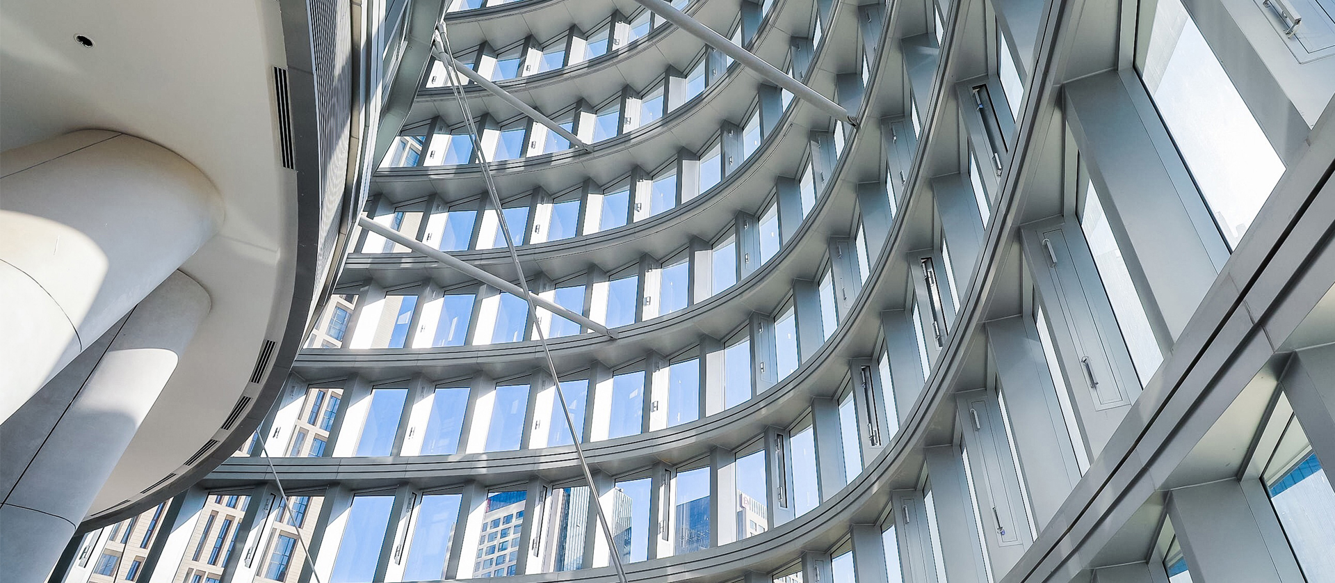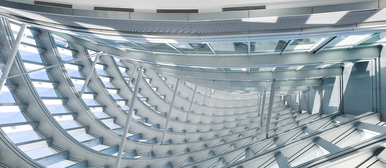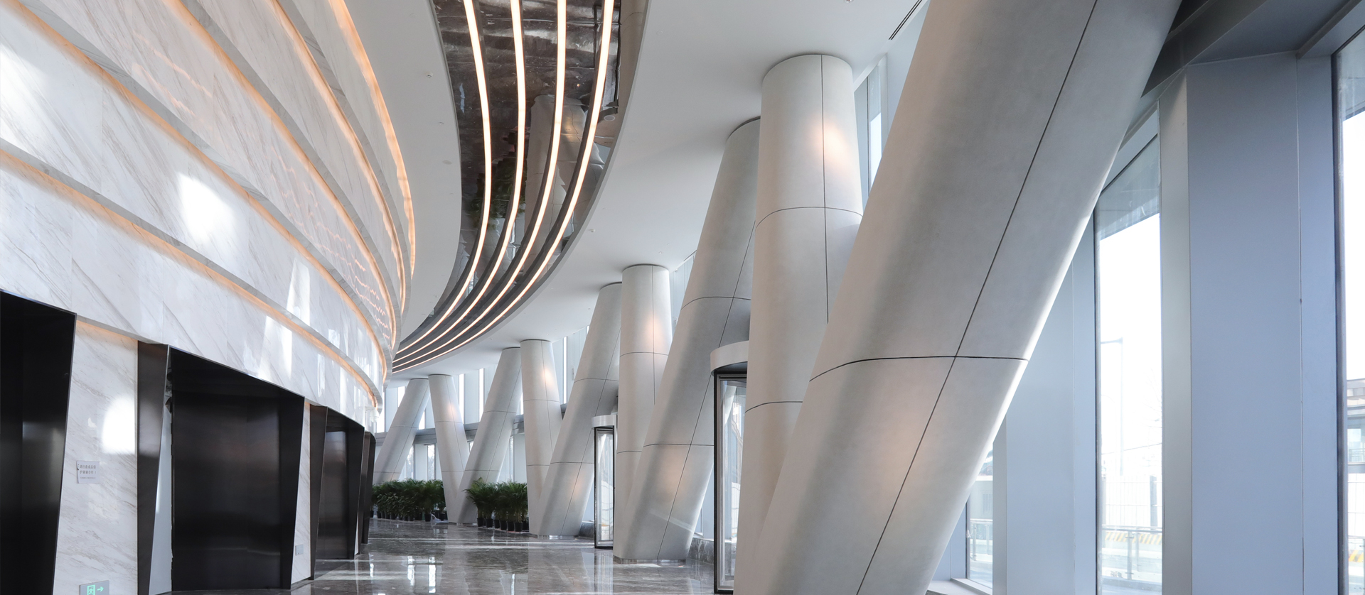 由于位于環(huán)形軸線上的地下柱子已經(jīng)建成,為了實(shí)現(xiàn)與放射軸線控制的地上外幕墻柱的連接,在首二層采用V柱進(jìn)行轉(zhuǎn)換,將地下結(jié)構(gòu)通過極具表現(xiàn)力的手法轉(zhuǎn)換到樓上結(jié)構(gòu),同時(shí)符合結(jié)構(gòu)受力特性。屋頂Y柱作為外幕墻柱在穹頂?shù)难由欤瑫r(shí)也具備重要的視覺需求。為了降低截面尺寸,設(shè)計(jì)將其模擬樹形分叉,在頂部收攏到一個(gè)圓環(huán)。內(nèi)穹頂結(jié)構(gòu)也沿放射軸線向中心匯聚到核心筒,最終與外穹頂網(wǎng)架聯(lián)系在一起,形成了非常穩(wěn)定的雙層穹頂結(jié)構(gòu)。