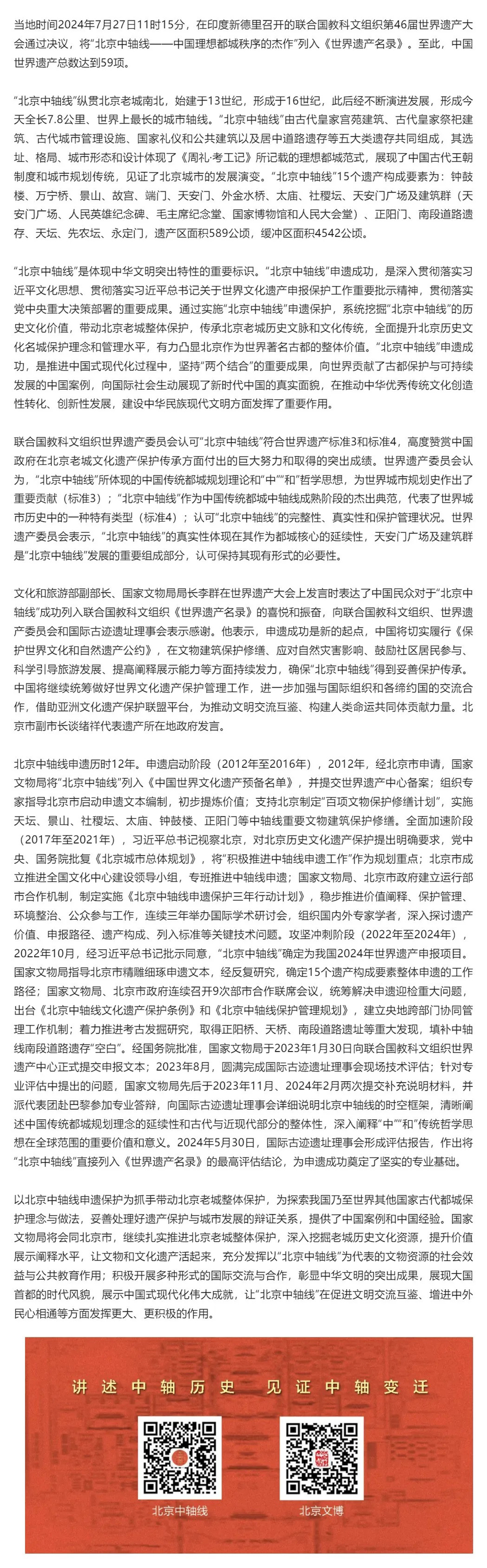 當?shù)貢r間2024年7月27日,在印度新德里召開的聯(lián)合國教科文組織第46屆世界遺產(chǎn)大會通過決議,將“北京中軸線——中國理想都城秩序的杰作”列入《世界遺產(chǎn)名錄》。